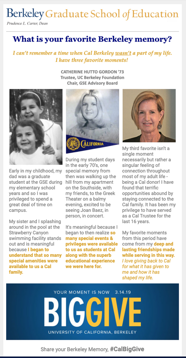 Along with her sister Eileen, Catherine was a member of the GSE Dean’s Advisory Board, and most recently Catherine served as chair. Catherine supported educational causes across the country, but UC Berkeley had a special place in her heart. From her years as a child swimming at Strawberry Canyon pool, to her time as a Cal student, and later as a member of the UC Berkeley Foundation Board of Trustees, Berkeley was Catherine's second family.